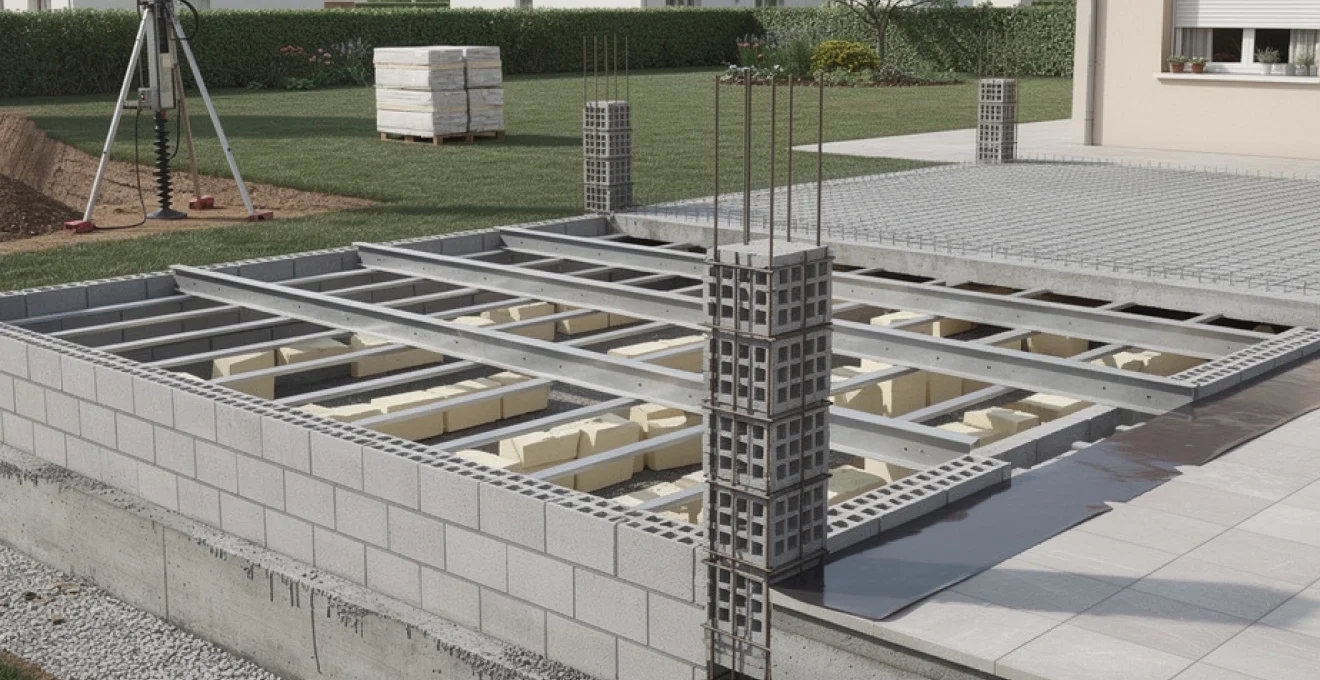 La phase de fondations et d’infrastructure matérialise tout le travail de conception réalisé en amont. Sur le terrain, on commence par l’implantation précise de la terrasse surélevée à l’aide de piquets et de cordeaux, en vérifiant l’équerrage et les cotes par rapport à la maison. Le terrassement est ensuite réalisé à la profondeur définie par l’étude géotechnique, en tenant compte de la profondeur hors gel locale. Le fond de fouille est soigneusement nivelé et compacté, puis une couche de forme en gravier peut être mise en place pour améliorer le drainage sous les semelles.
